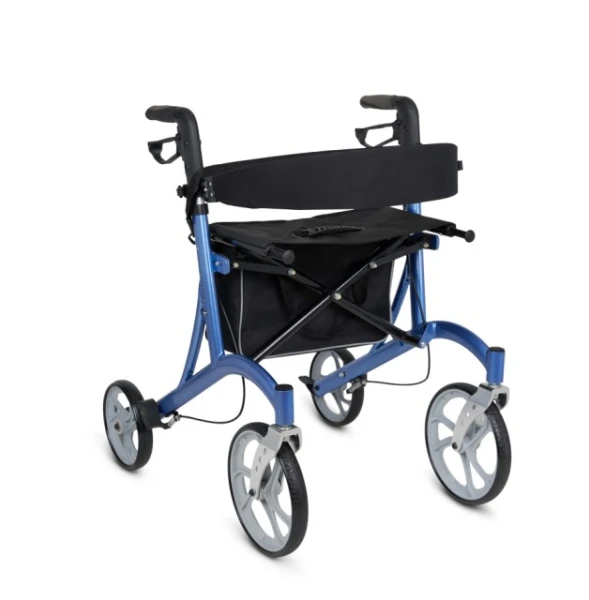 Роллатор имеет большие колеса, мягкую спинку, удобное сиденье, ручные тормоза. Складная конструкция облегчает хранение, а выдвижные ручки позволяют настроить высоту изделия под рост пользователя.