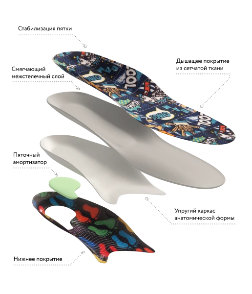 Анатомический каркас поддерживает формирующийся свод стопы для профилактики плоскостопия.