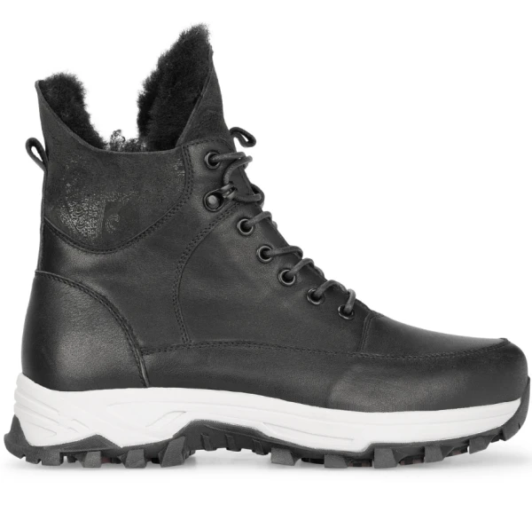 Модель оснащена скрытой шнуровкой, способствующей регулированию полноты обуви, а молния с внутренней стороны послужит более комфортному надеванию. Противоскользящая подошва имеет небольшой каблук и выполнена из термопластичной резины, устойчивой к различного рода повреждениям и химическим абразивам, используемым в зимний период на дорогах. Материал подкладки и стельки-натуральный мех.