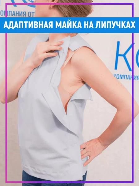 Куртка полуприлегающего силуэта, плечевая линия расширена для удобства пользования протезом, центральная застежка на молнии, месторасположение карманов изменяется по желанию заказчика, капюшон съемный. Расширена линия плеча, увеличена пройма втачивания рукава. Юбка снабжена шлевками, кулисками с кольцами, позволяющими самостоятельно обслуживать себя при физиологических отправлениях, фиксируется на талии. Блуза полуприлегающего силуэта,