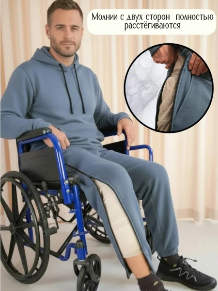Адаптивные демисезонные брюки с молнией на ноге — это одежда для тех, кто восстанавливается после травм, операций или сталкивается с возрастными ограничениями подвижности. Уникальные боковые молнии на штанине позволяют надеть брюки самостоятельно, даже при сниженной моторике, не нужно ждать помощи!Мягкий хлопковый материал согреет на прогулке и не стеснит движений во время лечебной гимнастики. Брюки одинаково удобны в квартире, во дворе, в больнице или санатории.