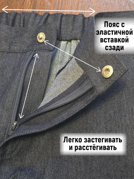 Конструкция включает кнопку на поясе и застежку-молнию на гульфике, а также потайные застежки-молнии по боковым швам от середины бедра до низа изделия. Такое решение упрощает процесс одевания и раздевания, обеспечивает доступ к ортопедическим конструкциям.