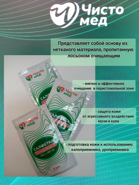Салфетка очищающая для ухода за кожей вокруг стомы представляет собой основу из нетканого материала, пропитанную лосьоном очищающим, упакованную в саше-пакет (или сашет). Размер салфетки - 180х180мм.