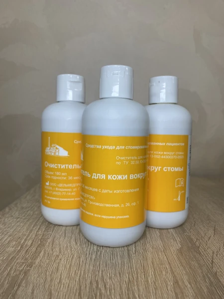 Очиститель Комфил (Comfeel®) для ухода за кожей вокруг стомы или свища, замещающий мыло и воду и другие агрессивные или высушивающие кожу вещества, для очищения кожи от кала, мочи, кишечного отделяемого, гноя, слизи, экссудата, удаления остатков пасты и других средств ухода за кожей, содержащий ланолиновое и кокосовое масла, аллантоин.